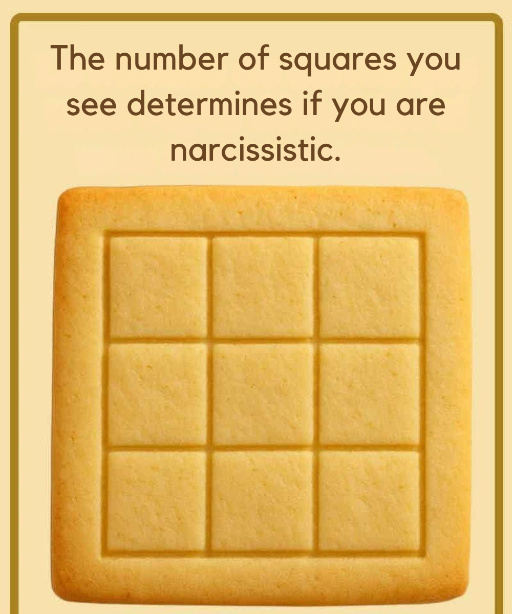 At first glance, this simple image, which looks like a cookie, seems harmless: just a simple grid etched into dough. But the question that accompanies it—“The number of squares you see determines if you are narcissistic”—catches everyone’s attention. It’s a fun psychological illusion that has gone viral online, sparking thousands of debates. Let’s explore what this puzzle really reveals about your way of thinking, your observational skills, and, yes, whether you might hide a few narcissistic tendencies beneath a calm exterior.